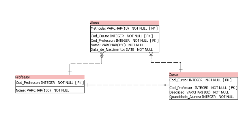 De cada aluno, será necessário armazenar: seu nome, matrícula, data de nascimento e idade, de cada curso será necessário armazenar a descrição e quantidade de alunos inscritos, e do professor, o seu nome.